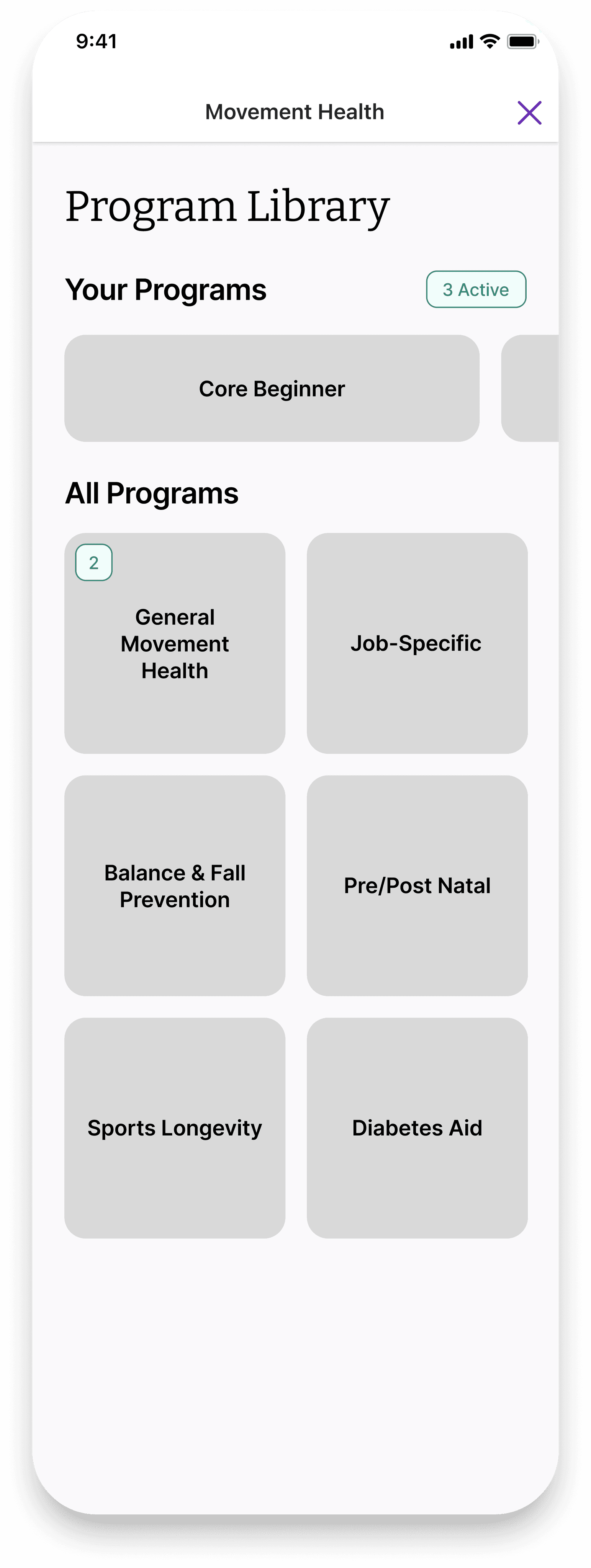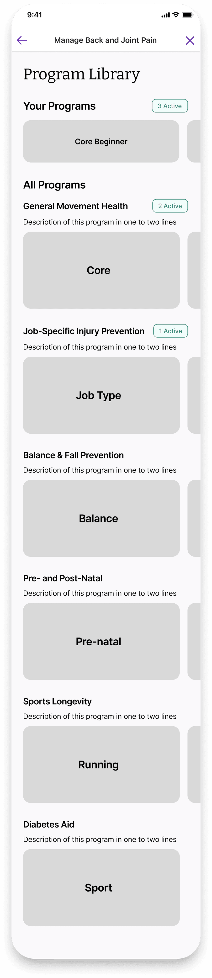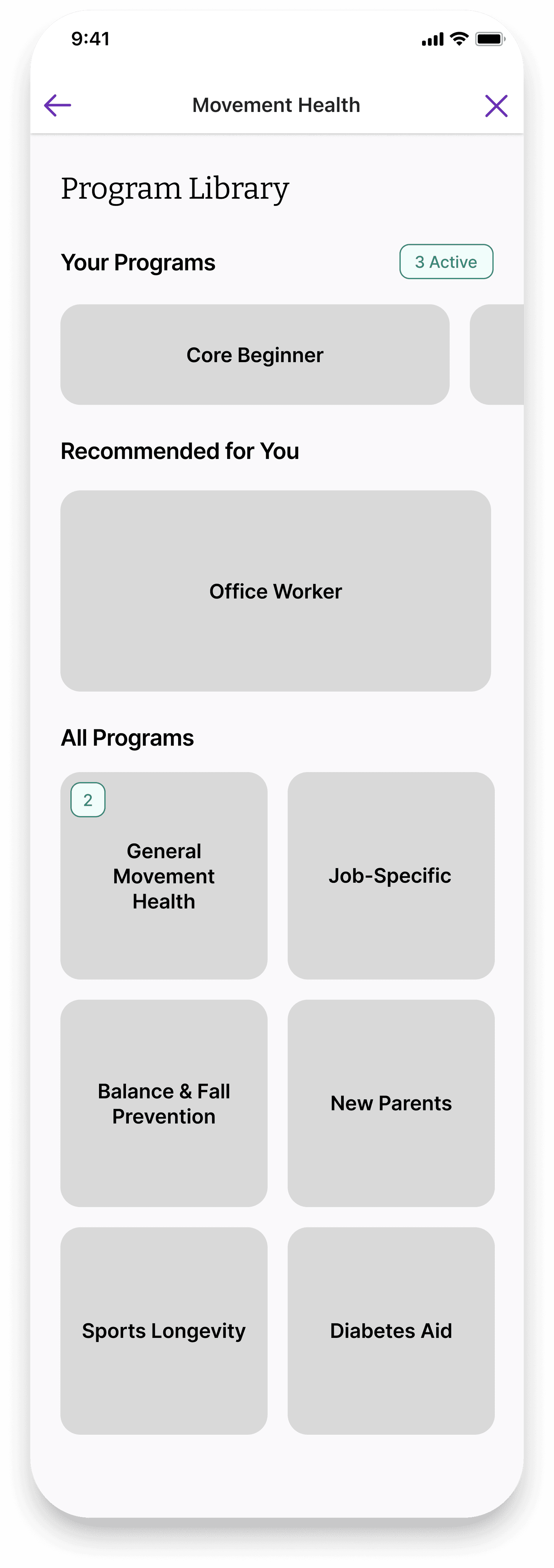 The Program Library is a new feature exclusive to Movement Health. There are 30+ programs separated into 6 categories: Movement Health, Job-Specific, Balance and Fall Prevention, New Parents, Sports Longevity, and Diabetes Aid. For version 1, the user needs to browse all programs, understand their context, and access the program page from the program library.