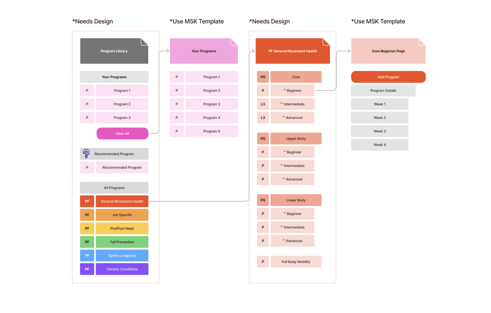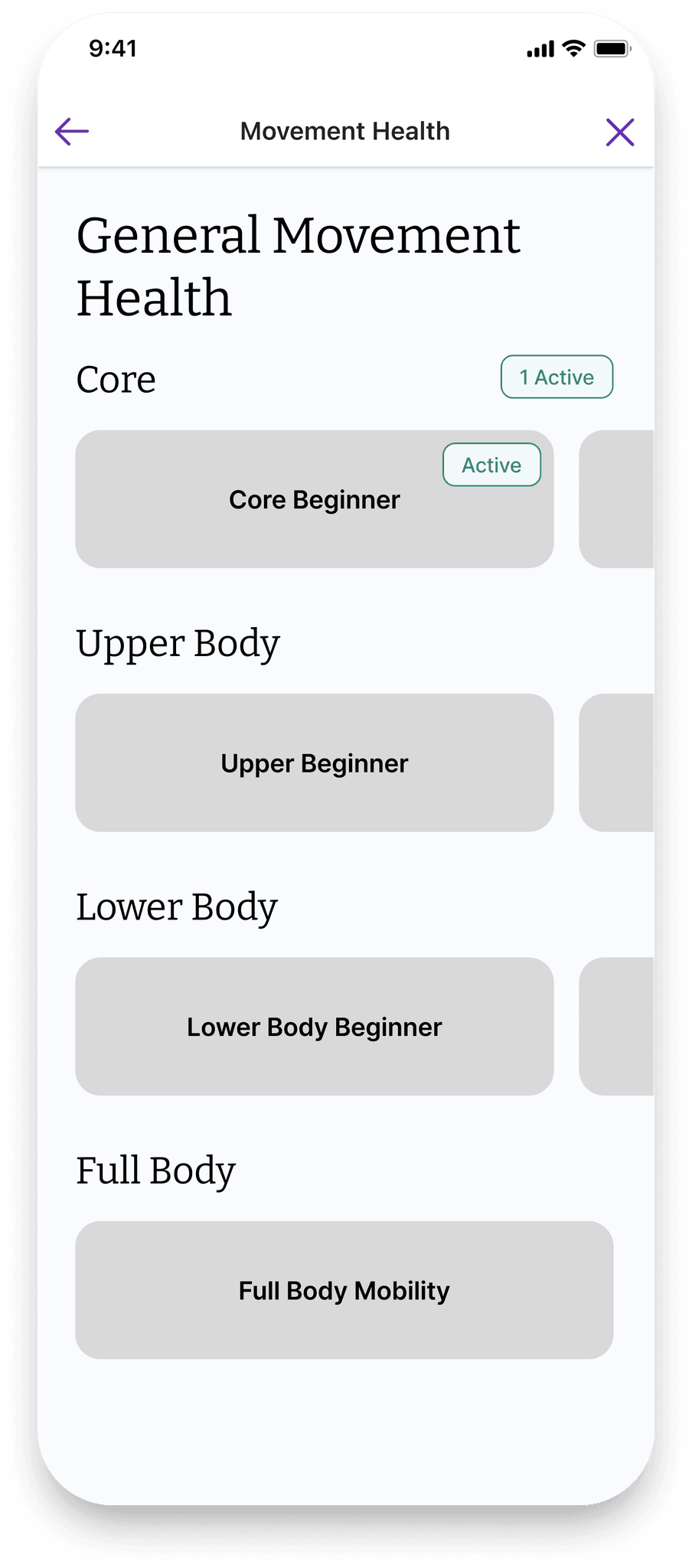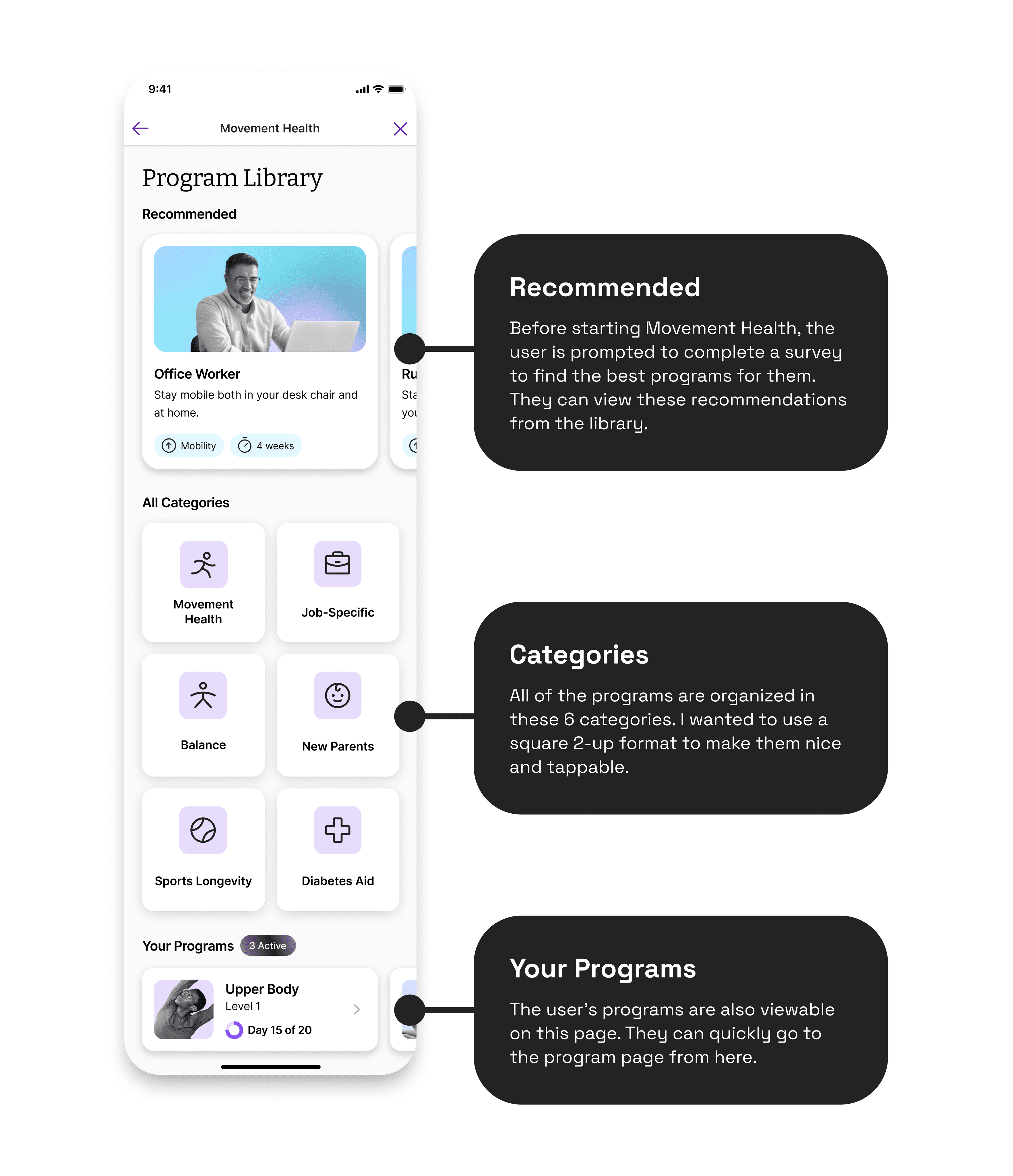 The Program Library is a new feature exclusive to Movement Health. There are 30+ programs separated into 6 categories: Movement Health, Job-Specific, Balance and Fall Prevention, New Parents, Sports Longevity, and Diabetes Aid. For version 1, the user needs to browse all programs, understand their context, and access the program page from the program library.